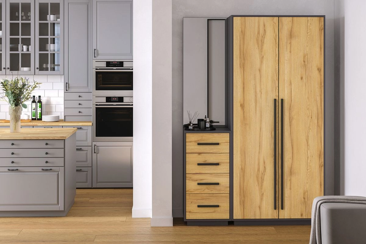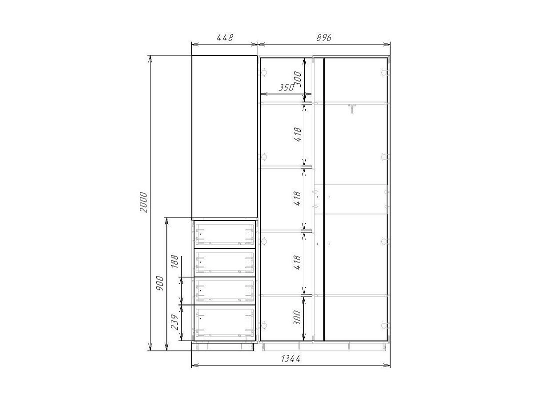 ЛДСП 16мм. Кромка в цвет корпуса. Направляющие на выдвижные ящики 100%. Штанга выдвижная 300мм. Ручки на шкаф арт.39215, ручки на комод арт. 39241